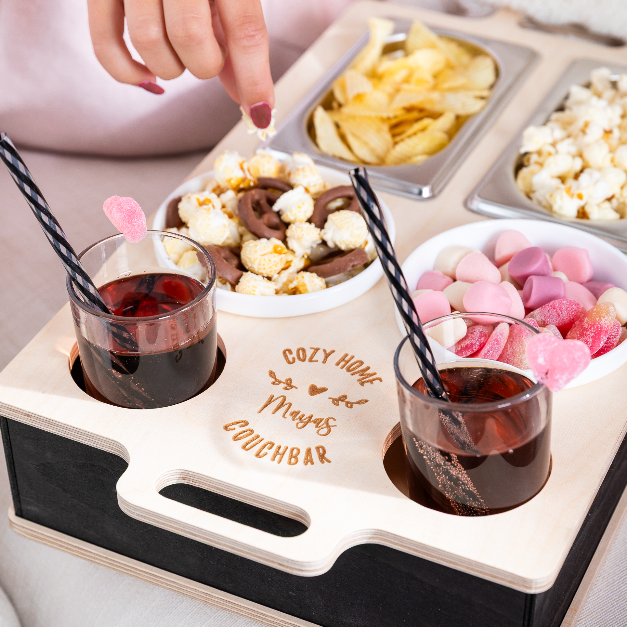 Die hochwertige CouchBar ist eine stilvolle, stabile Ablage für Snacks, Fernbedienungen und das Handy. Durch die Personalisierung mit einer Gravur wird dieses praktische Produkt zudem zu einem richtig persönlichen Unikat, das langanhaltend begeistert und jeden Feierabend aufwertet.