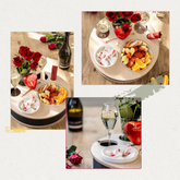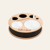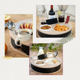 Höhe: 10cm | Länge/Breite: Ø 27cm | Getränkehalter: Ø 7,5cm | Flaschenhalter: Ø 9,5cm | Große Schale: Ø 17cm | Kleine Schale: Ø 12cm